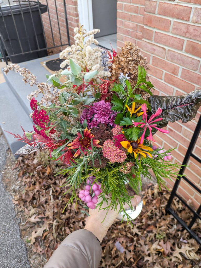 We made some beautiful cut flower arrangements well into the fall, too. I have a post about late-blooming native plants to add to your garden, but I also like using other things like dried seed heads, parsley sprigs, and Swiss chard in fall arrangements.