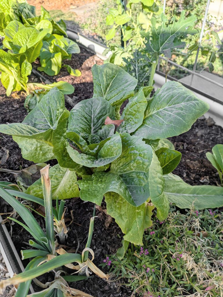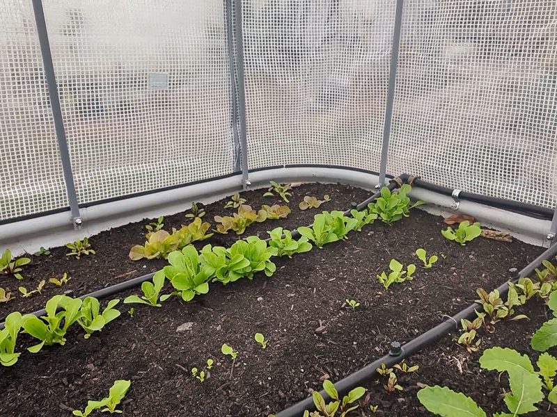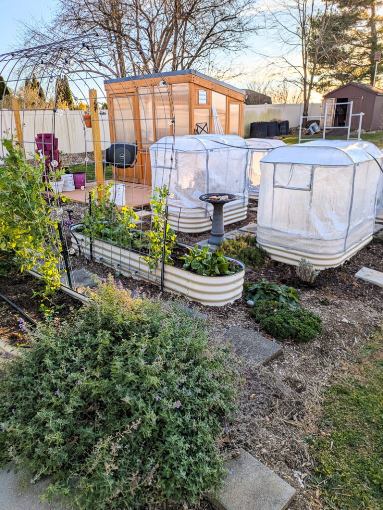 Beyond those two raised beds, I’ve got two raised beds that I am using my new Vego Greenhouse Covers on. These are made of high-quality plastic that helps insulate plants and extend the growing season. And they work beautifully!