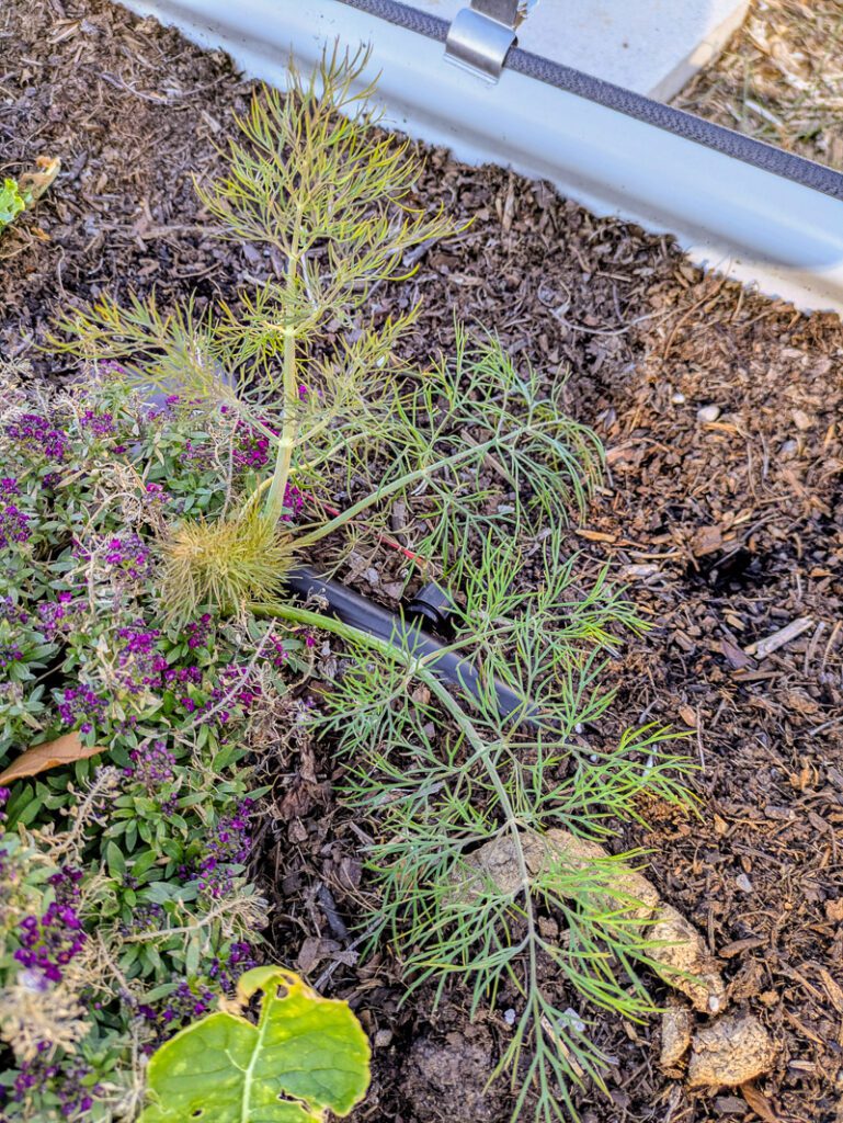 I love having this area be perennial herbs because they are so lovely and low maintenance for so much of the year. Plus, the strong scent is hopefully a helpful pest deterrent for some of the things I’ve got growing in the raised beds up here!
