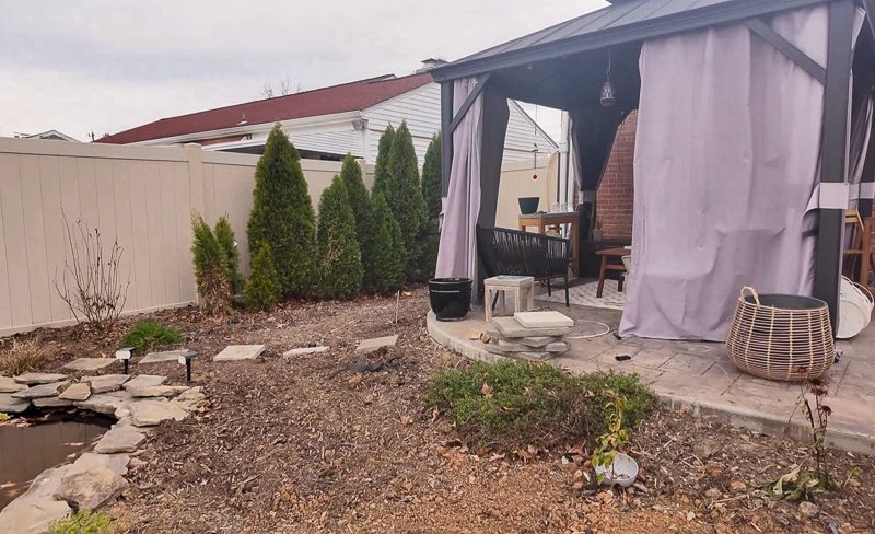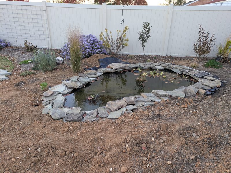 We reused all of the rocks from the previous pond and got some giant flagstone pavers from my mom’s friend for free. We busted those up with a hammer to put around the pond, and it worked perfectly. I might add some more rocks next spring when we landscape around it, but we’ll see.