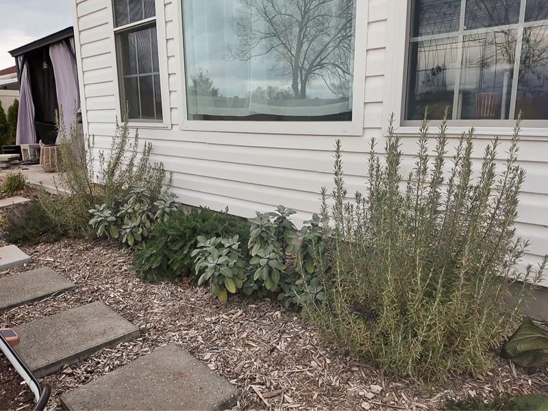 Last fall, I replaced some of the landscaping up here with perennial herbs. I have creeping thyme on each end, and then working toward the yarrow in the center, I put in rosemary and sage. They were all propagations from elsewhere in the yard.