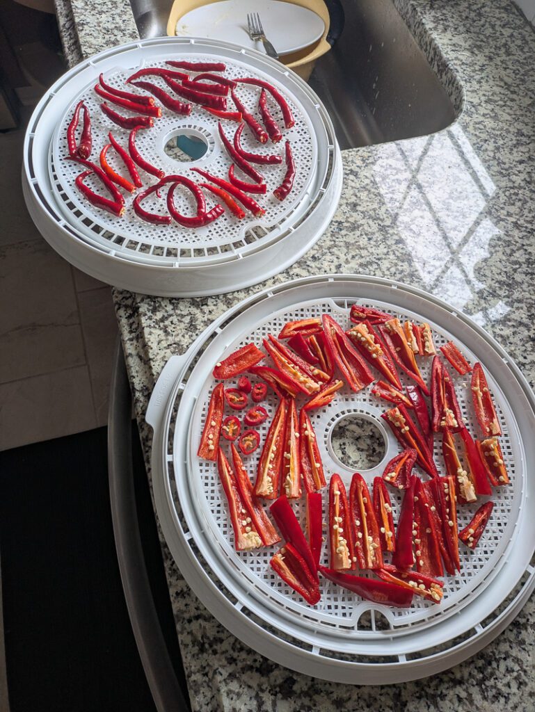 I also got a dehydrator on Facebook marketplace this summer and dehydrated a ton of herbs. I made a bunch of spice mixes with hot peppers, too. They are so much more potent than many of the ones you buy in stores, so a little goes a long way. I just snipped the stems off, dehydrated them, and ran them through a food processor.