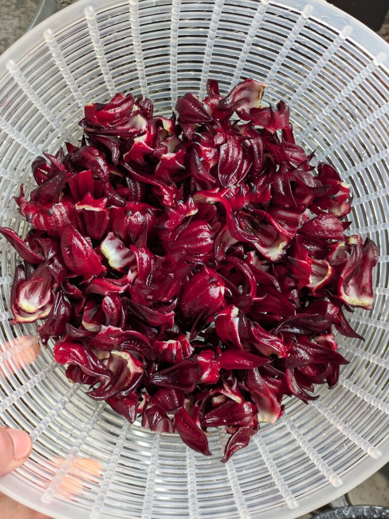 And I processed a bunch of roselles from my Hibiscus Sabdariffa plant. These are super easy to snip off, wash, and dehydrate for teas and whatnot. I love their tart taste, and the leaves on the plant are edible, too.
