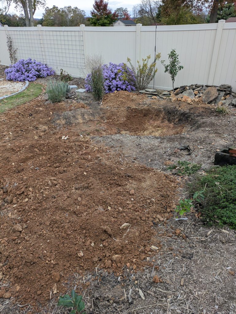 My husband decided he wanted to expand the pond. Yes, the pond we just put in last year. I was all for it, but I didn’t think he was going to jump into it this fall. Well, I came home one day, and he had dug out this whole area and moved on to digging out the pond.