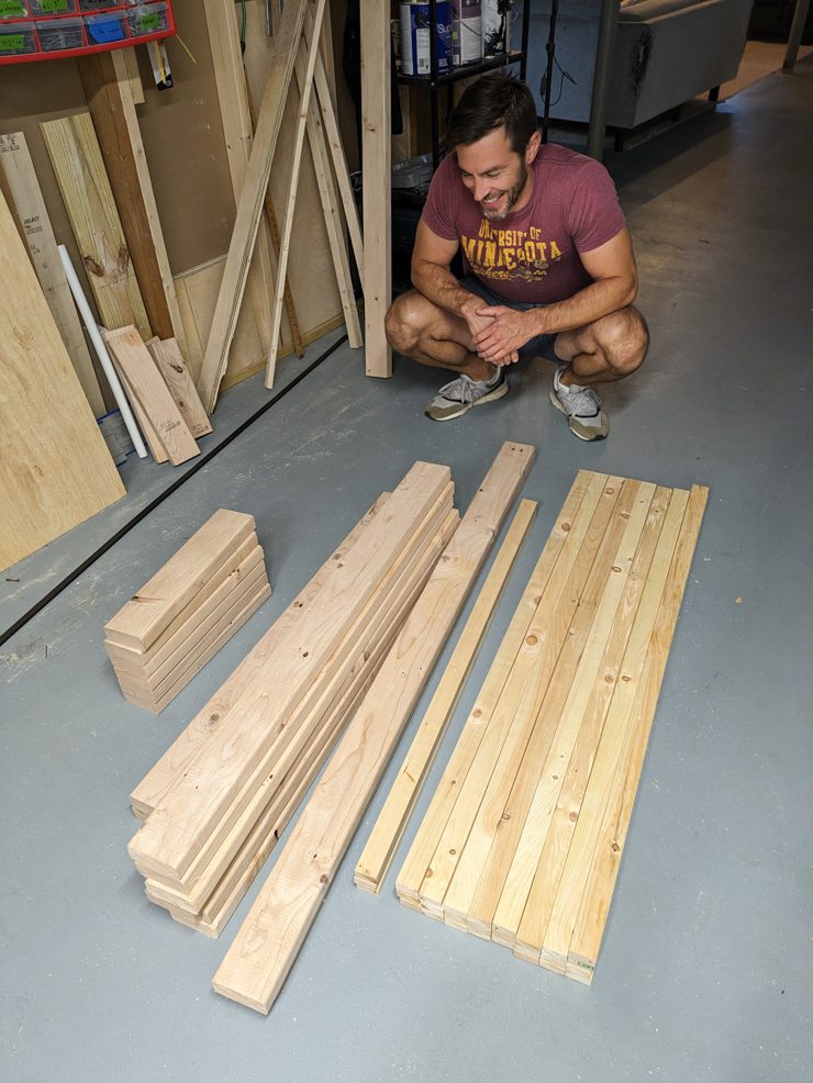 The bench is made entirely of 2x4s and 1x2s. Here is what I cut based on my closest store having 96″ and 120″ 2x4s in stock, as ell as 96″ and 120″ 1x2s. (Note that the image below labeled 1x4s should be 1x2s…sorry!)