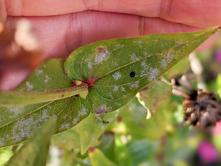 If you notice white spots on your zinnia plant’s leaves, it’s likely powdery mildew. It is a common disease among many plants, not just zinnias. It shows itself as white to gray powdery spots on the plant’s leaves—occasionally on the stems and flowers, too.
